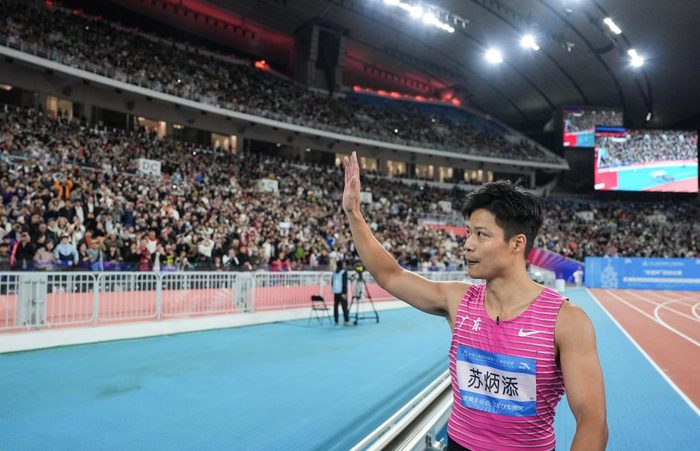 2025年11月20日,苏炳添在比赛后向观众致意。
